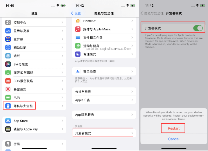 IOS16+出现“需要启用开发者模式”(自签名成功才会出现):【设置】-【隐私与安全性】-【开发者模式】-【开启】-重启手机