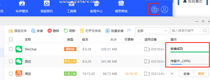 如果提示“签名成功”手机没有图标,需要点爱思右上角的下载中心(下载箭头),在其中点击“安装”。